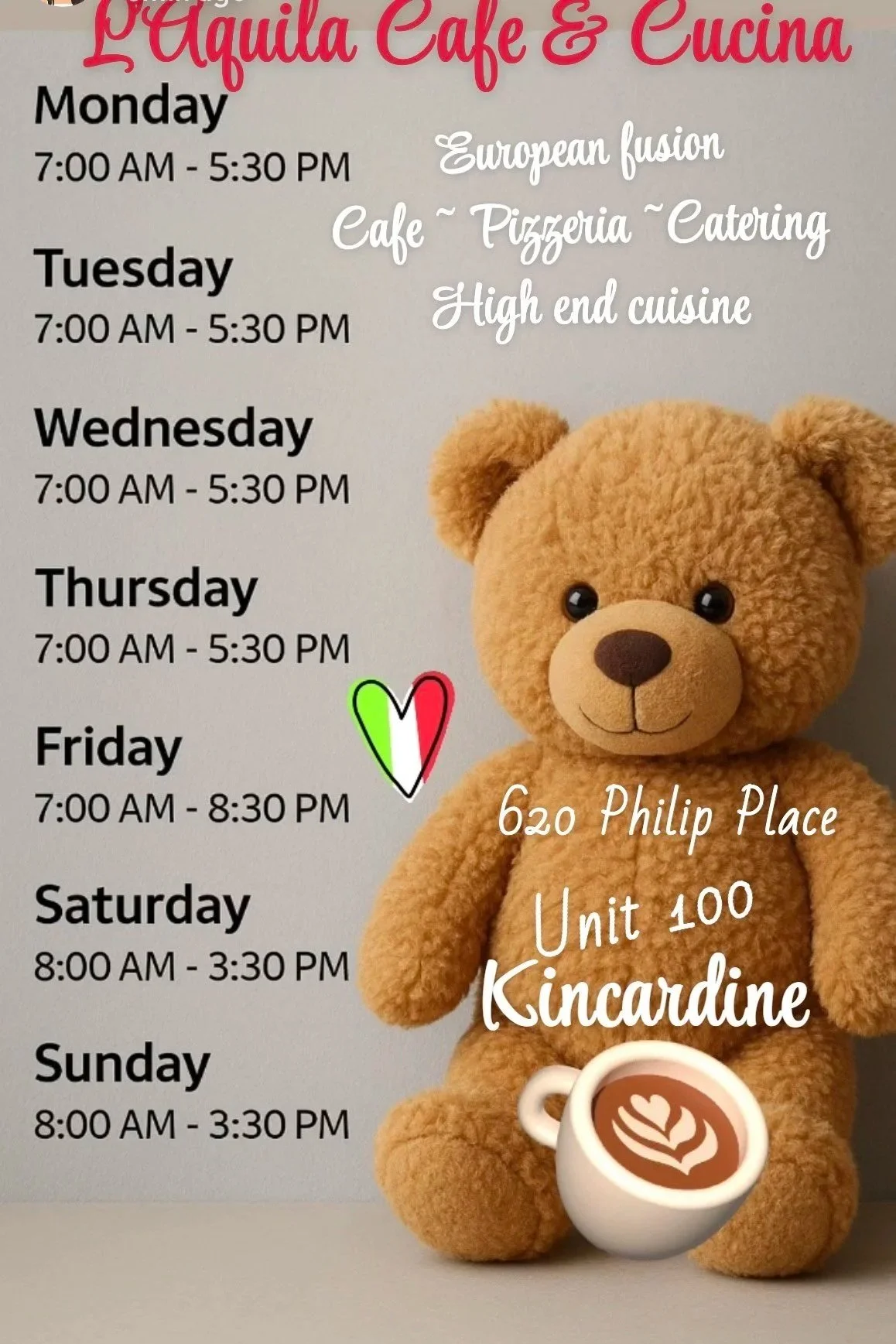 L’Aquila Café & Cucina is a high-end, European-inspired café and culinary brand located in Kincardine, Ontario. The café blends Italian café culture with modern convenience, offering handcrafted espresso beverages, premium cold brews, artisanal pastries, hot lunch options, grab-and-go items, and specialty retail products. L’Aquila Café serves both the general public and the regional workforce, including Bruce Power and local contractors, offering a mix of dine-in, takeout, catering, and workplace meal services.